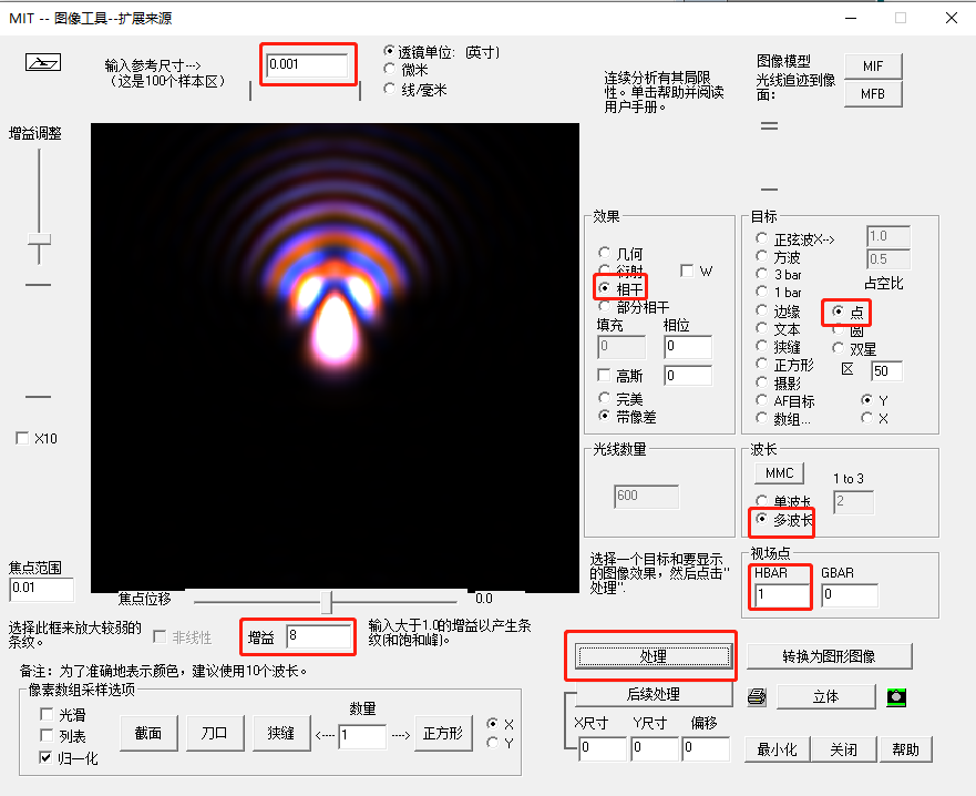 尝试使用“效果”部分中的“几何”和“衍射”选项。 相干分析结果更平滑一些。 它使用2-D FFT算法,而衍射方法评估衍射积分,减小到约为Airy斑半径的6倍。 相干选择通常最适合点源,并且在这里肯定更好。
