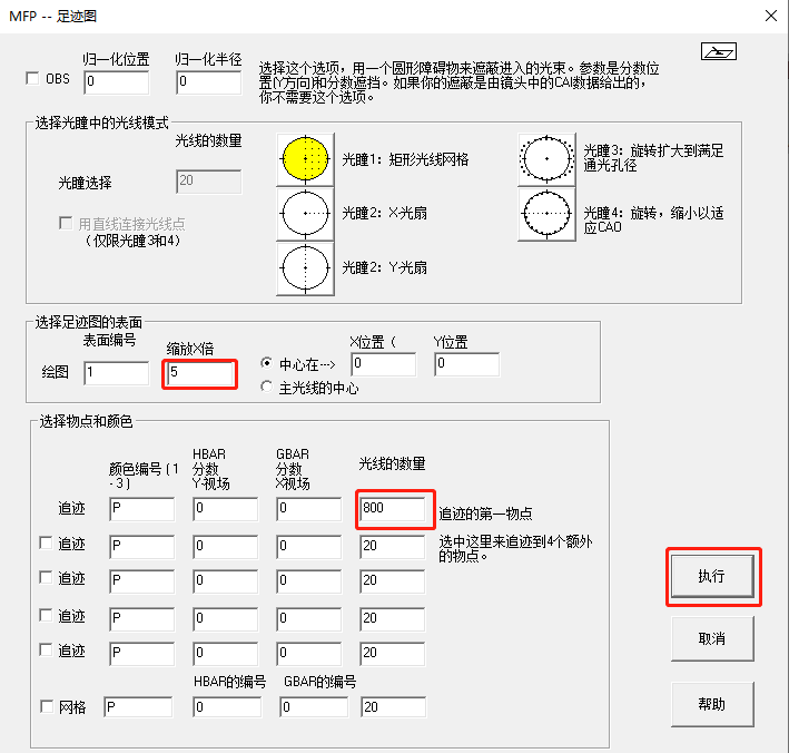 该系统有主要的默认孔径,尽管现在在表面1上存在用户输入的内孔径(CAI)以及表面2上的外椭圆孔径(EAO)。(菜单MLL(Menu, Lens Listings)也允许您运行CAP命令。)让我们在主镜像上创建一个足迹。 使用菜单树导航到MFP(或在CW中输入MFP)。 然后进行下面的选择并单击“执行”。