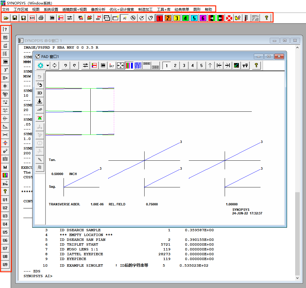 沿主窗口的左侧显示的工具栏提供了对SYNOPSYS的许多命令和特性的快速鼠标访问。主要包含了镜头库、获取镜头、SPEC镜头数据列表、LE镜头编辑器、三阶像差、DWG二维绘图、PER三维绘图、SOLID旋转绘图、RPT光扇图、RPO OPD光扇图、MDI衍射分析、MOP MTF分析、MGI几何分析以及点列图等按钮。