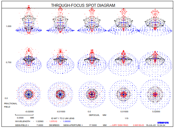 SYNOPSYS还支持其他类型的点列图分析。选择像质分析菜单栏中的点列图中的离焦点列图功能以及全视场点列图。您将看到当前透镜系统的点列图分析结果: